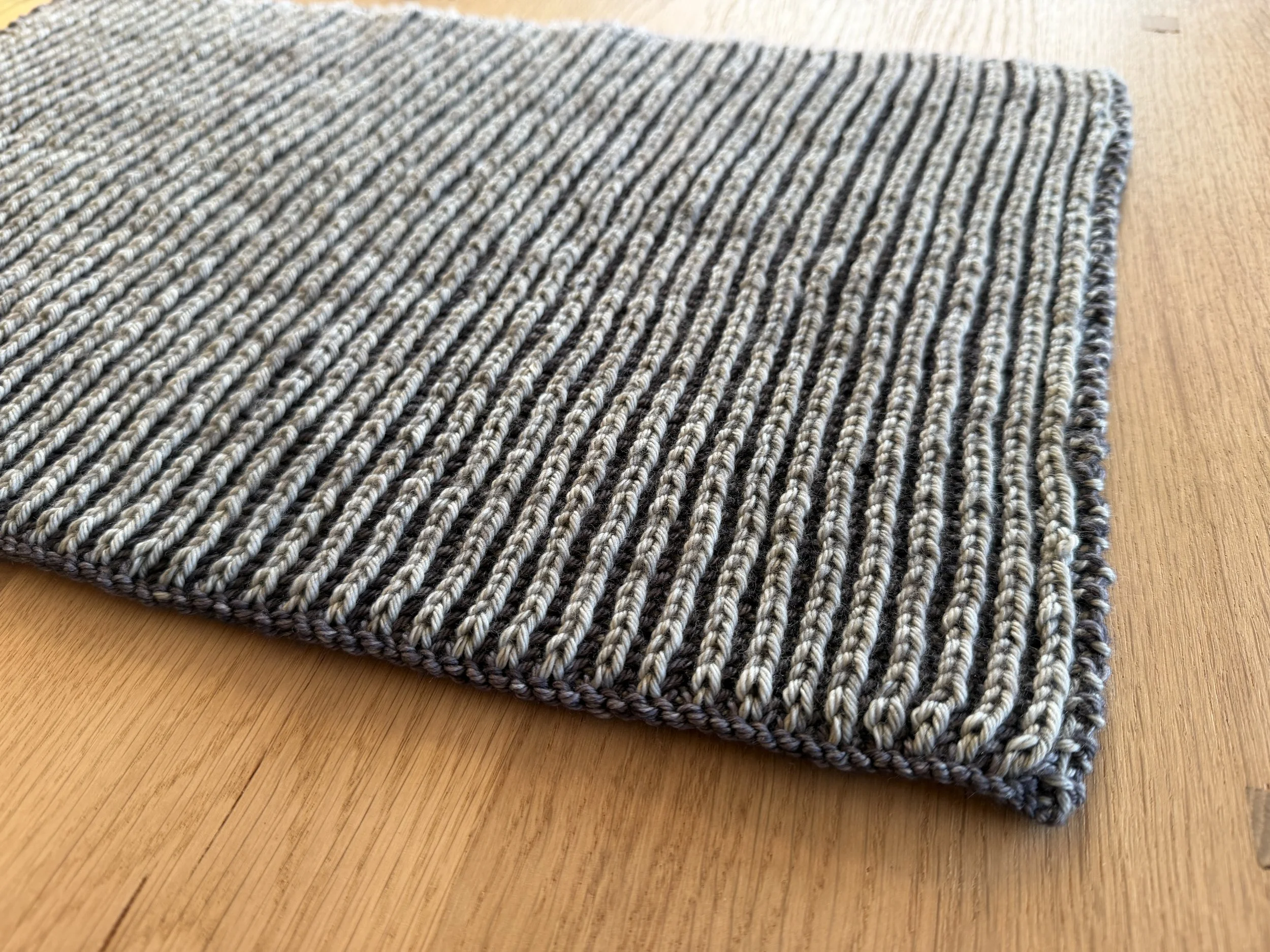I have turned the ubiquitous percussionist “black towel” into a personal exploration of knitting technique. My latest bespoke creation is a two-color brioche: reversible, squishy, luxurious:
