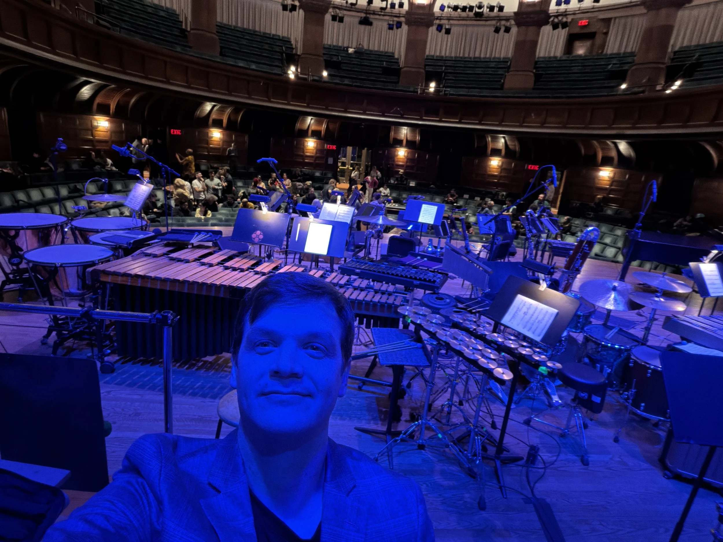 Just back from a very intense week at various venues: Bethany Arts Center (upstate), the Annenberg Center (UPenn), and Princeton (Richardson Hall). Great to work with some wonderful artists: serpentwithfeet, Bora Yoon, Shelly Washington, and nine composers in the Princeton doctoral composition program. We also did my own Hanabi, which continues to be an outlet for this former marching tenor player to “get it out of my system.” Here’s a little pre-show selfie from that one: